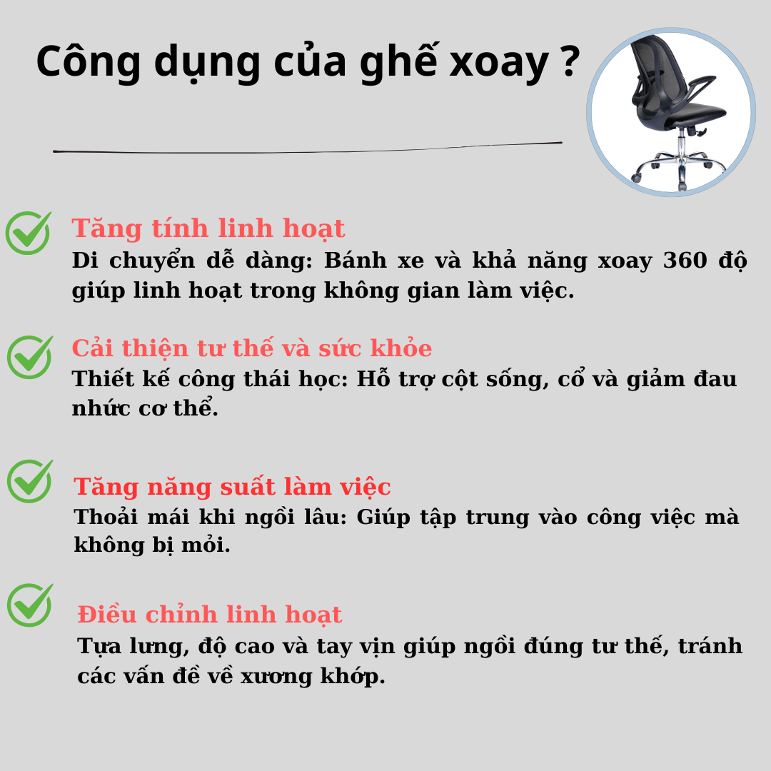 • Thoải mái tối đa: Thiết kế ghế với đệm tựa êm ái và khả năng điều chỉnh linh hoạt giúp bạn làm việc và thư giãn thoải mái suốt cả ngày.