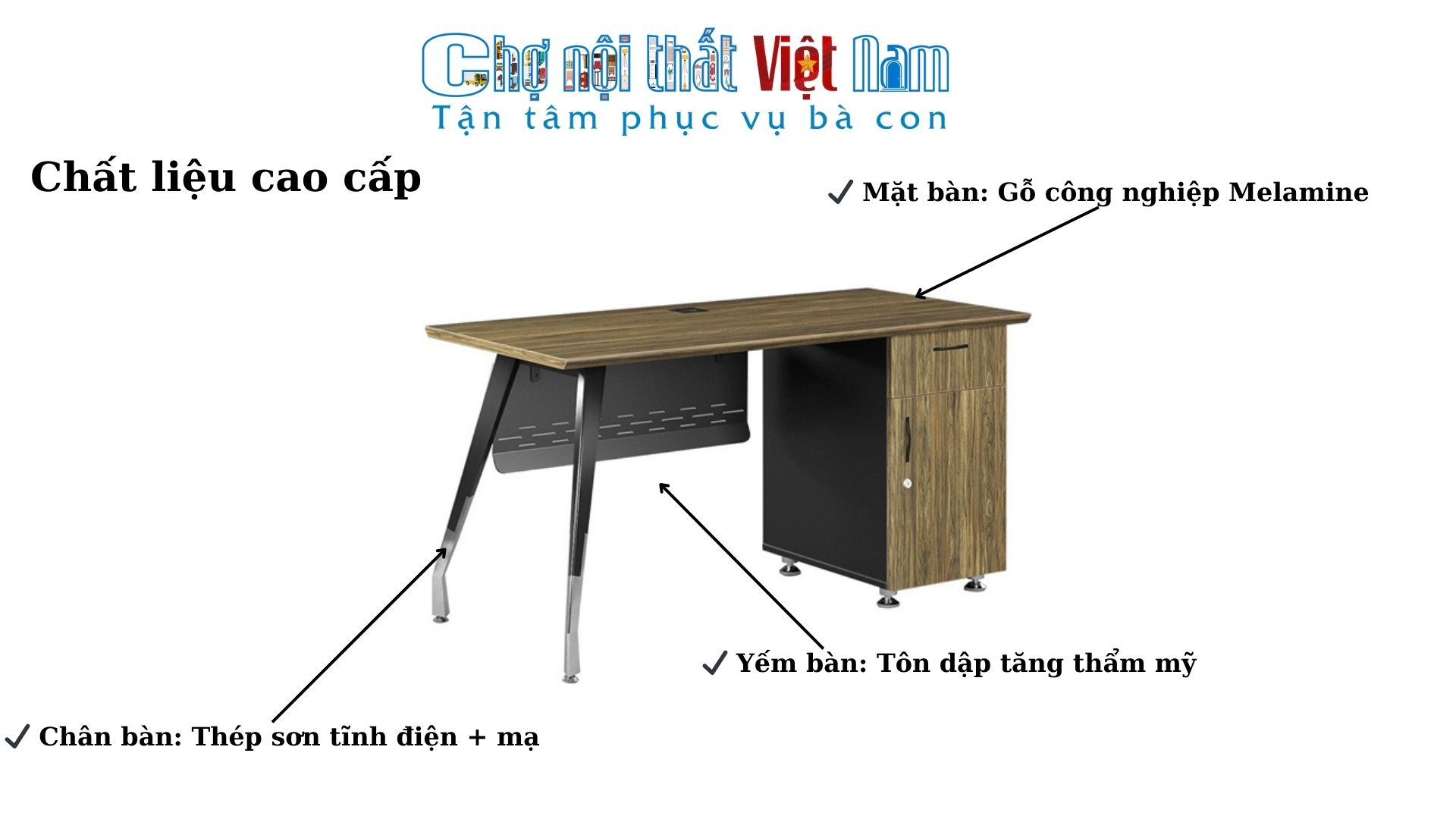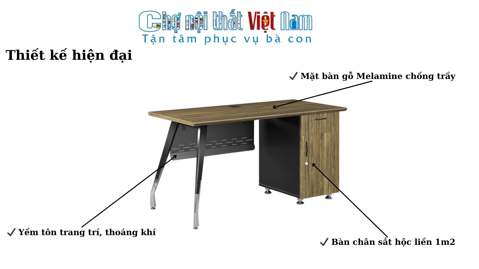 ✔ Thiết kế chuyên nghiệp: Khung chân sắt chắc chắn, tích hợp hộc liền tiện dụng.