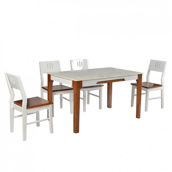 Cả bộ bàn ghế ăn này sử dụng tông màu trắng làm chủ đạo có điểm phần đệm ngồi của ghế và phần chân bàn bằng gỗ màu cánh gián. Chính sửa kết hợp như vậy đã tạo ra điểm nhấn độc đáo cho bộ sản phẩm. Không gian căn phòng thêm tươi mới, bữa ăn được ấm cúng, quây quần hơn, mọi thành viên được gắn kết với nhau.