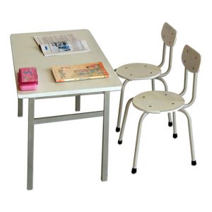 - Ghế: Khung thép sơn tĩnh điện chắc chắn, chân ghế hình chữ U giúp tăng độ vững chắc. Đệm tựa gỗ sơn PU bào vệ bề mặt, chống trơn trượt, an toàn cho bé.
