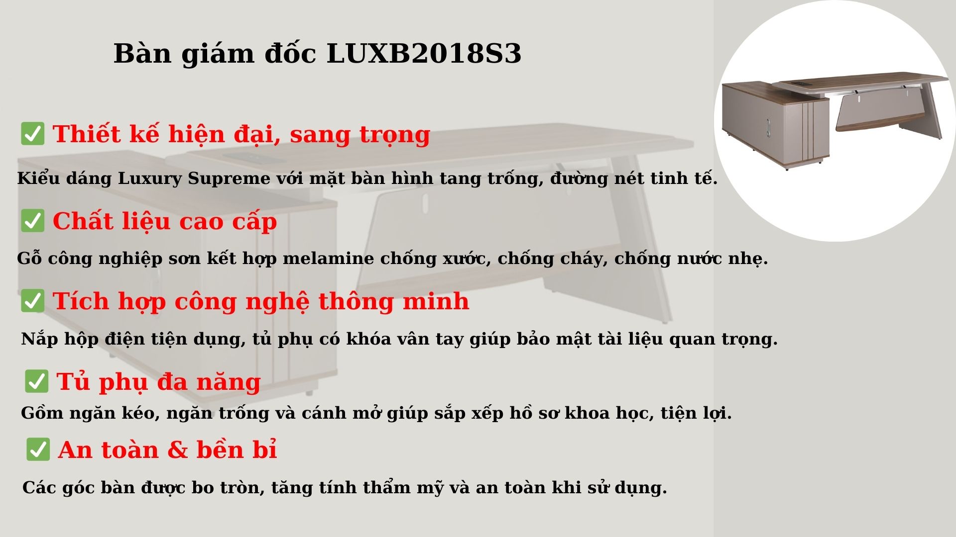 Bàn giám đốc LUXB2018S3 là dòng sản phẩm cao cấp từ Chợ Nội Thất Việt Nam, mang phong cách sang trọng, hiện đại, giúp không gian làm việc trở nên chuyên nghiệp và đẳng cấp.