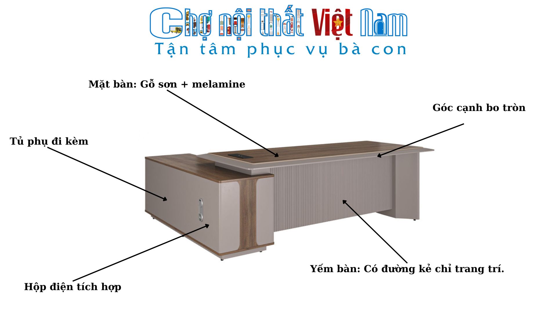 - Mặt bàn tích hợp nắp hộp điện, tiện lợi khi sử dụng các thiết bị văn phòng.