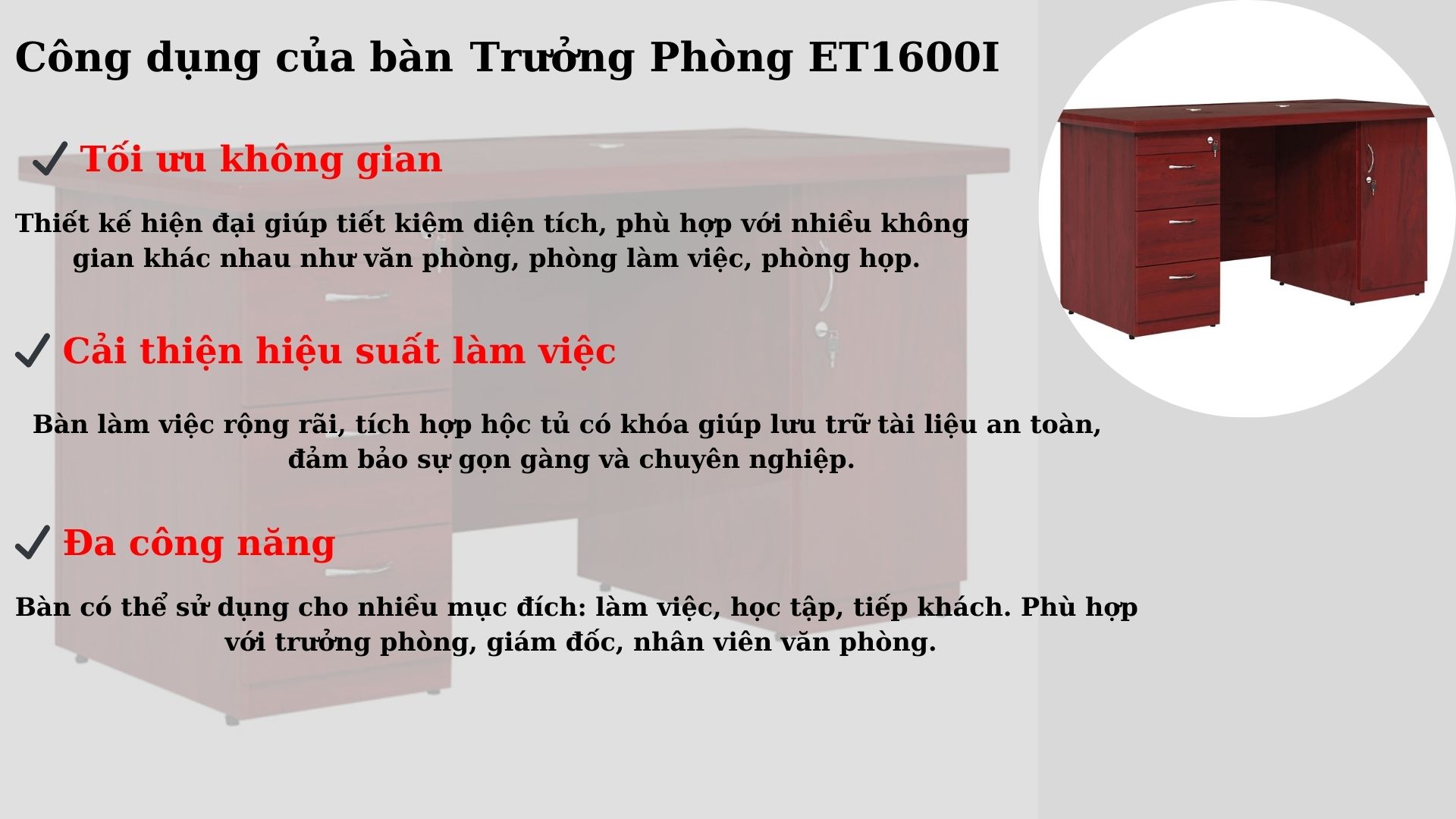- ✔ Dễ dàng kết hợp: Bàn trưởng phòng ET1600I thường được sử dụng cùng ghế trưởng phòng, ghế xoay văn phòng để tạo không gian làm việc chuyên nghiệp.
