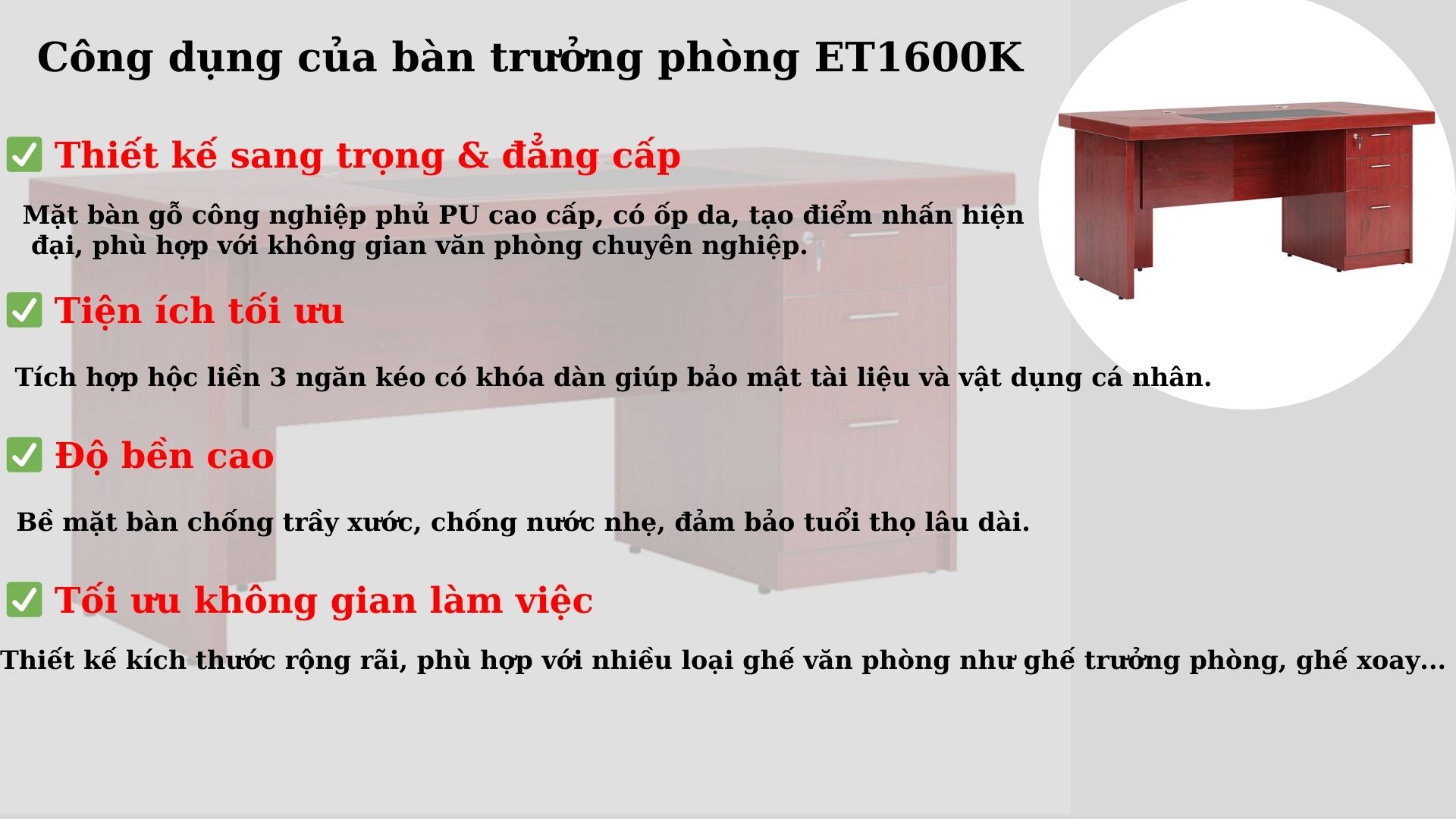 👉 Mua ngay bàn trưởng phòng ET1600K để nâng tầm không gian làm việc của bạn!