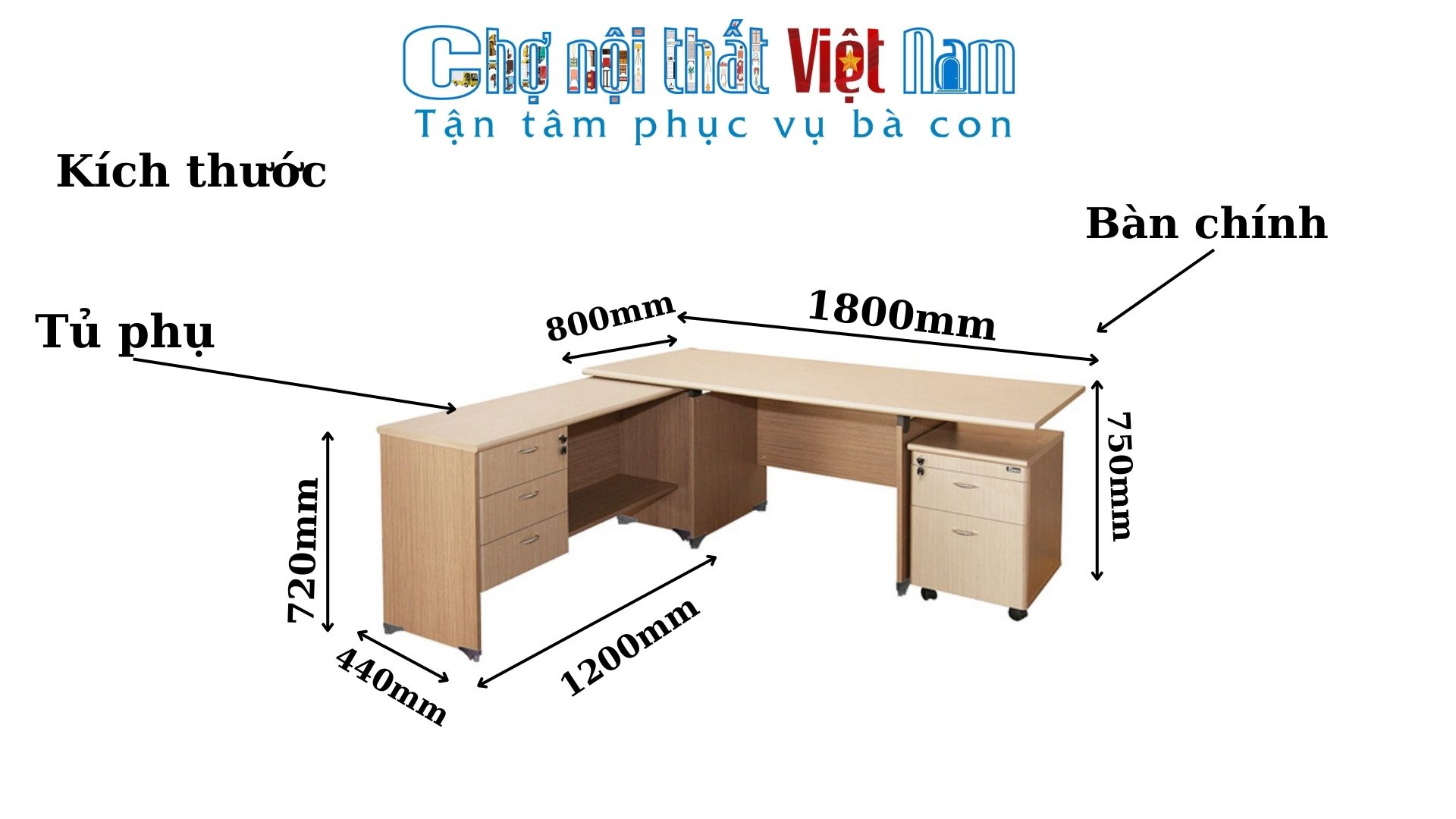 - Bàn làm việc chính: W1800 x D800 x H750 mm