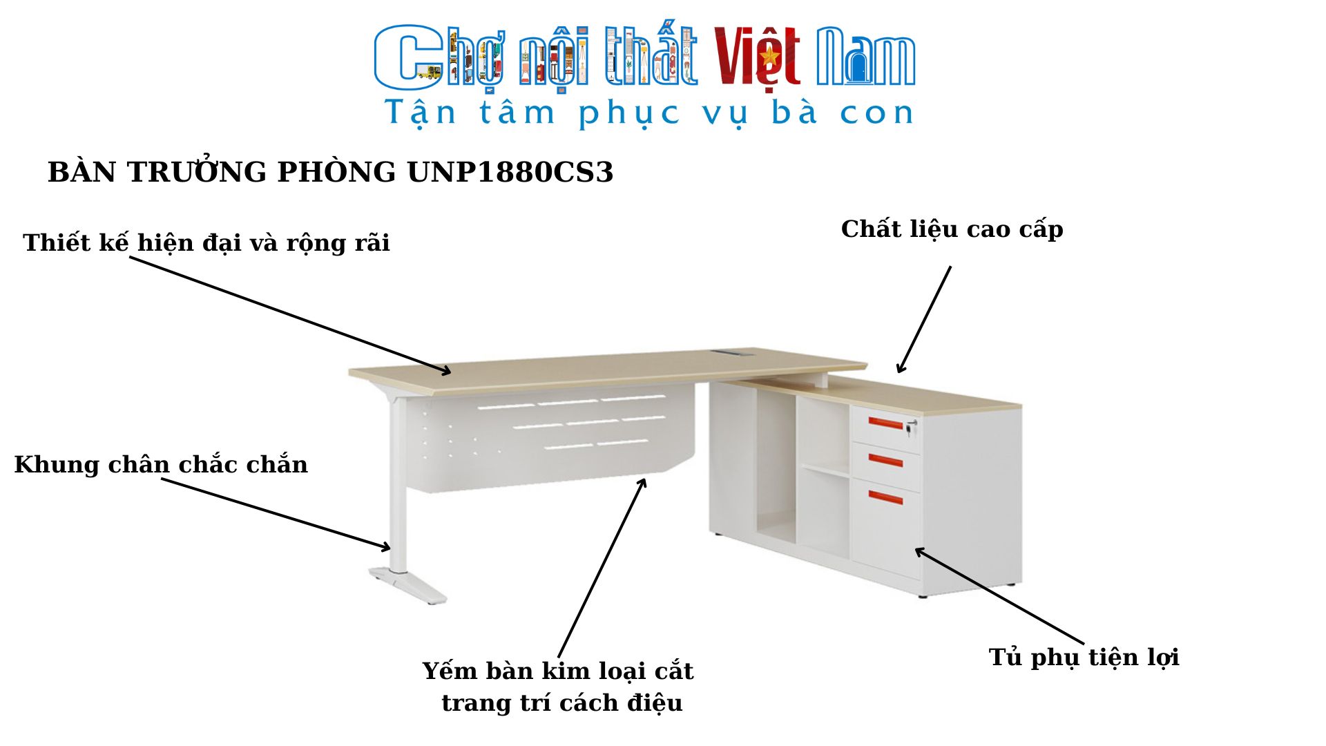 Bàn trưởng phòng UNP1880CS3 đến từ Chợ Nội Thất Việt Nam là lựa chọn hoàn hảo cho những nhà quản lý mong muốn một không gian làm việc sang trọng, hiện đại và tiện nghi. Với thiết kế độc đáo, chất liệu cao cấp, sản phẩm này không chỉ mang đến sự bền bỉ mà còn giúp nâng tầm đẳng cấp văn phòng.
