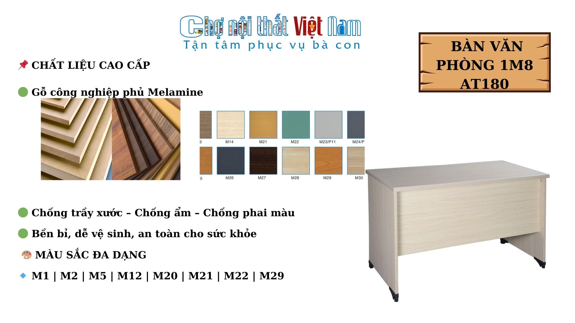 Bàn được làm từ gỗ công nghiệp phủ Melamine, đây là chất liệu hiện đại có nhiều ưu điểm vượt trội: