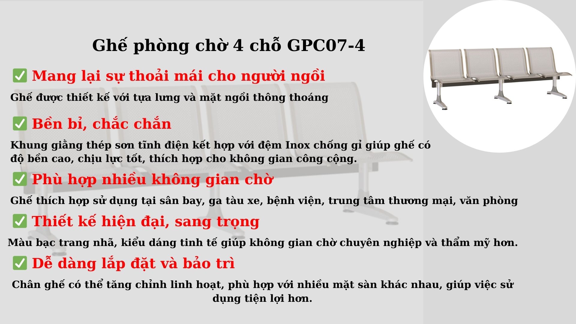 Ghế băng chờ GPC07-4 của Chợ Nội Thất Việt Nam là lựa chọn lý tưởng cho các khu vực phòng chờ như sân bay, nhà ga, bệnh viện, doanh nghiệp và các khu công cộng. Sản phẩm có thiết kế chắc chắn, chất liệu cao cấp cùng khả năng chịu lực tốt, mang lại sự thoải mái tối đa cho người sử dụng.