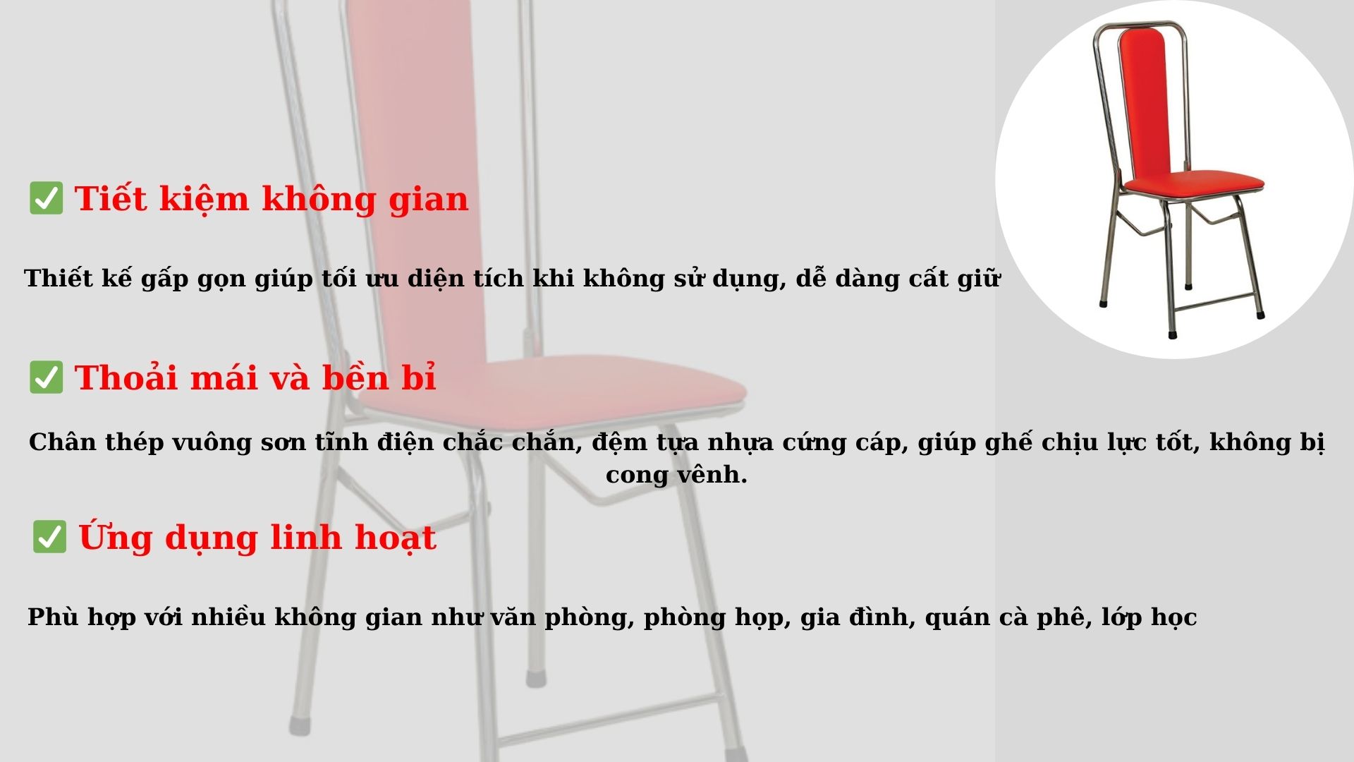 ✅ Ghế cho không gian nhỏ: Gấp gọn khi không sử dụng, tối ưu diện tích tối đa.