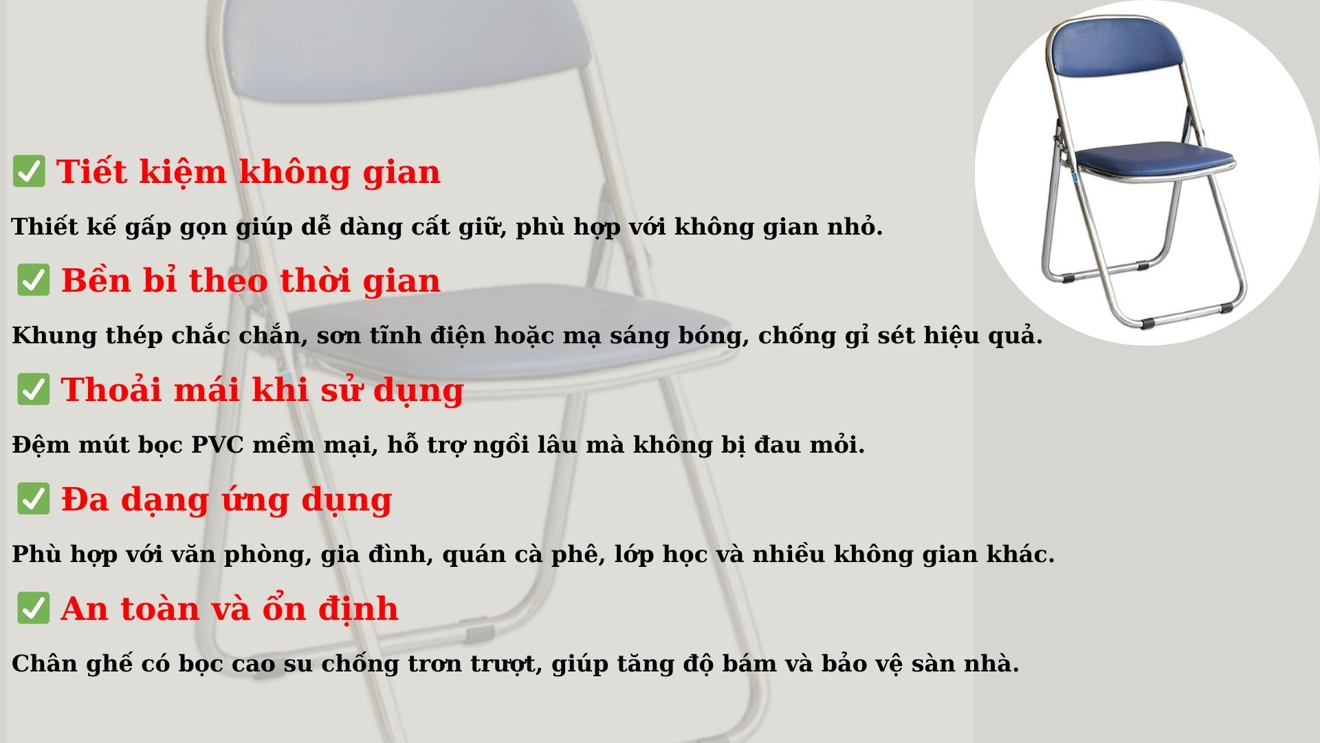 Ghế gấp khung thép G03 từ Chợ Nội Thất Việt Nam là sản phẩm được đánh giá cao về tính tiện dụng, thiết kế hiện đại và độ bền vượt trội. Phù hợp với nhiều không gian như văn phòng, nhà ở, hội trường hay quán cafe.