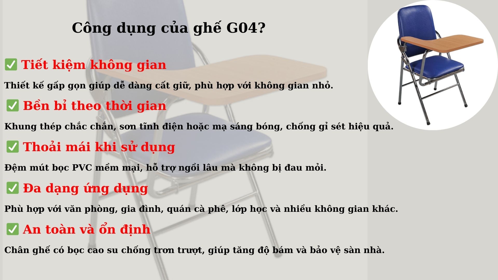 🟢 Xác định nhu cầu sử dụng: Nếu bạn cần một chiếc ghế cho học tập, hội nghị hoặc văn phòng, G04B là lựa chọn hoàn hảo.