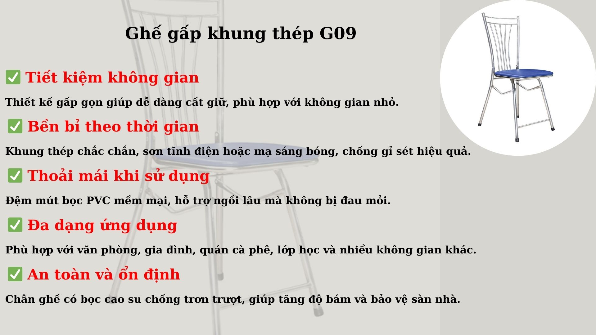 Bạn đang tìm kiếm một chiếc ghế gấp vừa bền bỉ, tiện dụng lại có thiết kế sang trọng? Ghế gấp khung thép G09 từ Chợ Nội Thất Việt Nam chính là sự lựa chọn hoàn hảo. Với thiết kế gọn nhẹ, chắc chắn, cùng khả năng tiết kiệm không gian tối ưu, sản phẩm này là giải pháp lý tưởng cho văn phòng, hội trường, lớp học, nhà hàng và cả không gian gia đình.