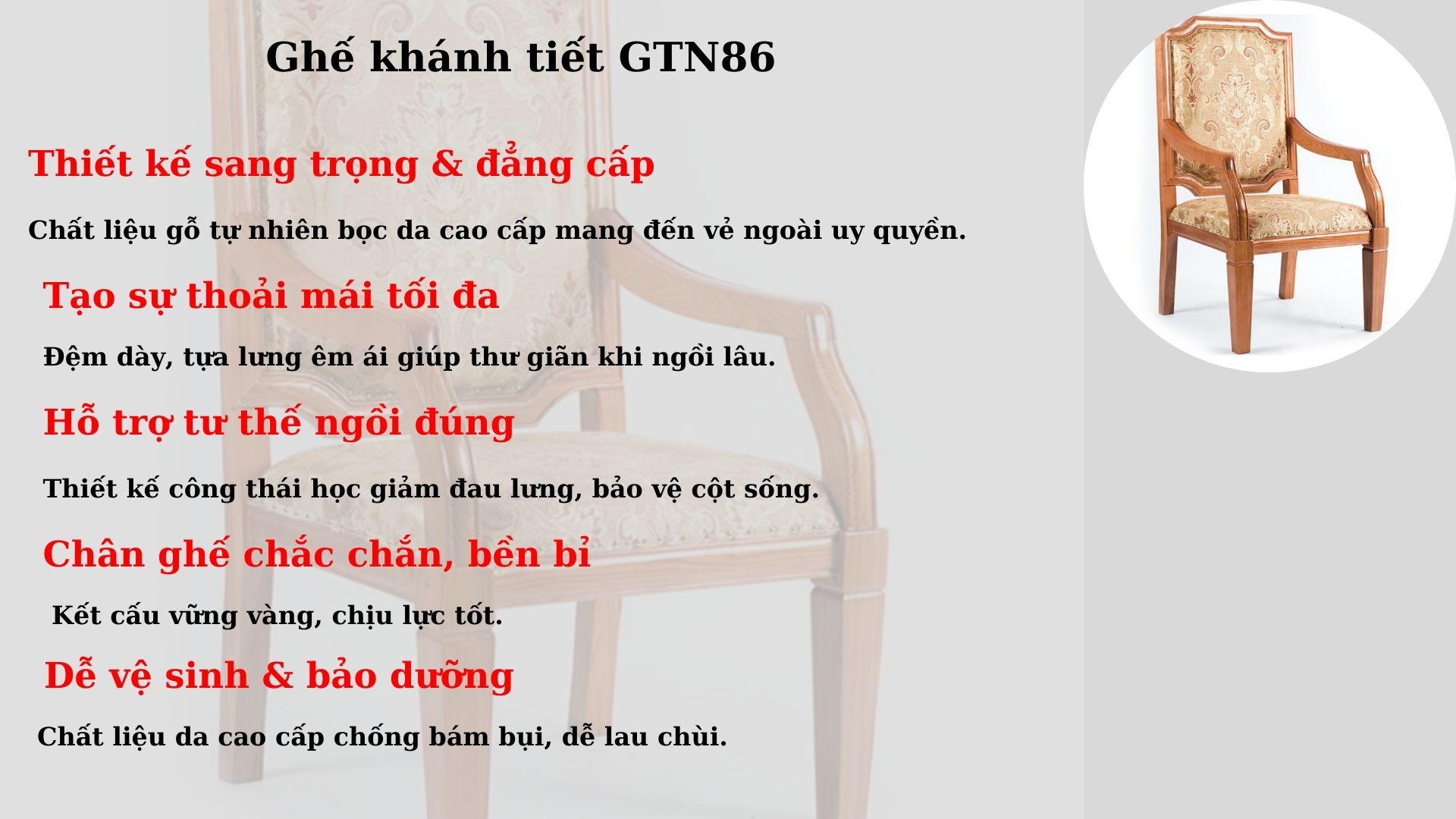 Ghế khánh tiết GTN86 là mẫu ghế cao cấp dành cho các không gian sang trọng như phòng khánh tiết, hội nghị, phòng họp cấp cao hay phòng khách VIP. Với thiết kế tinh tế, chất liệu gỗ tự nhiên bền bỉ và lớp đệm bọc nỉ êm ái, sản phẩm không chỉ mang lại sự thoải mái mà còn thể hiện đẳng cấp và vị thế của chủ nhân.