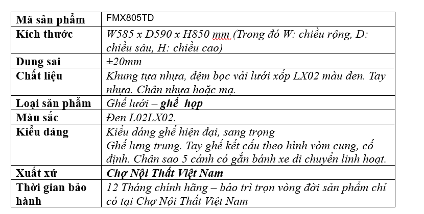 Đó là mô tả chi tiết về ghế FMX805TD. Hy vọng rằng thông tin này sẽ giúp khách hàng có thêm lựa chọn sản phẩm phù hợp với nhu cầu của mình.