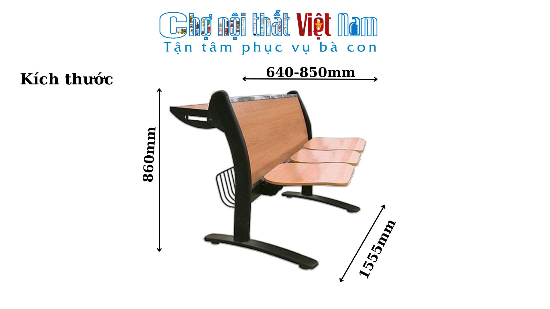 Kích thước: Băng 3 chỗ: W1555 x D(640-850) x H860 mm