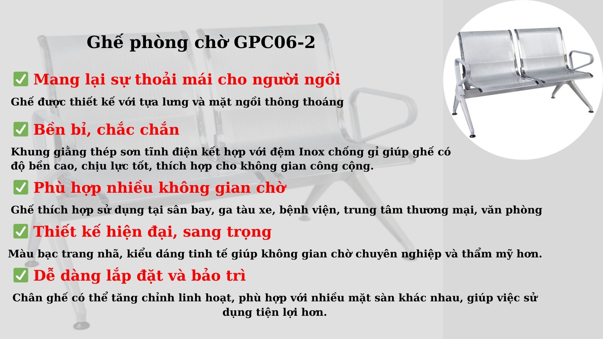 Ghế băng phòng chờ Chợ Nội Thất Việt Nam GPC06-2 là sản phẩm được thiết kế tối ưu cho không gian công cộng như sân bay, ga tàu, bệnh viện, văn phòng và các trung tâm thương mại. Với kiểu dáng hiện đại, chất liệu cao cấp và độ bền cao, ghế mang lại trải nghiệm thoải mái và bền bỉ theo thời gian.