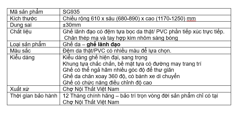 Chợ Nội Thất Việt Nam SG935 có thiết kế hiện đại và uy quyền. Tựa lưng liền đệm, có đường may trang trí tao điểm nhấn cho sản phẩm. Đệm ghế thiết kế lõm vừa vặn người ngồi, mút xốp bọc da thật/PVC tiếp xúc trực tiếp, êm ái mang đến sự thư giãn trong quá trình sử dụng.