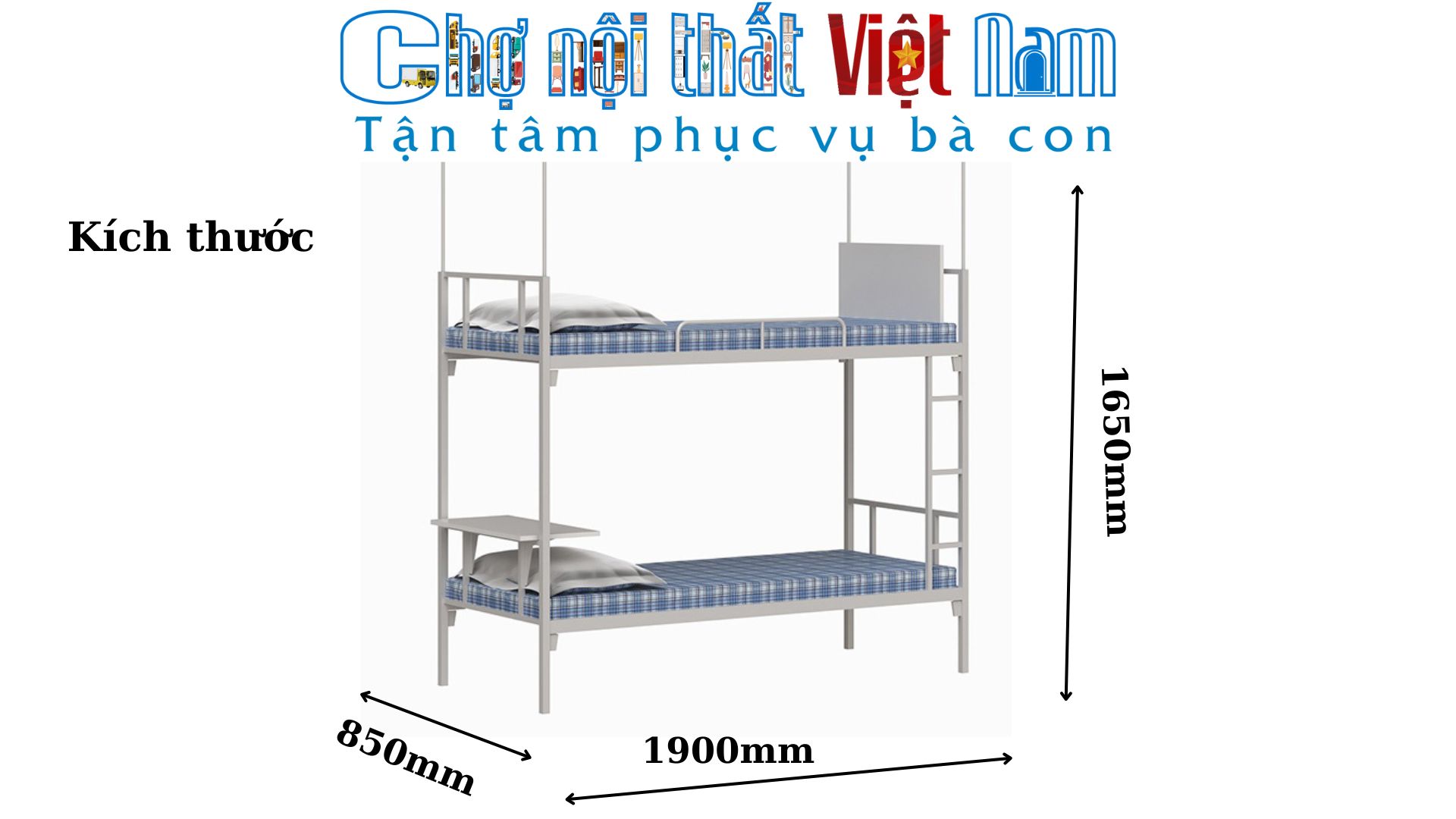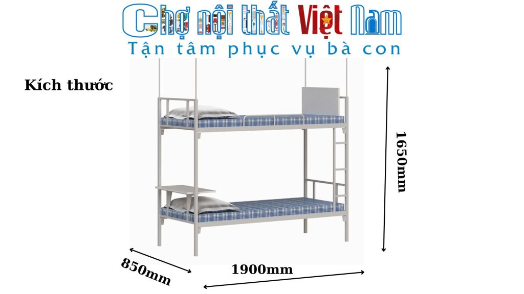 Giường tầng sinh viên GT40B của Chợ Nội Thất Việt Nam là lựa chọn tối ưu cho ký túc xá học sinh, sinh viên hoặc các khu nhà ở công nhân. Sản phẩm kết hợp giữa sự bên bỉ, tiện lợi và tính đa năng khi tích hợp bàn viết ngay trên giường.