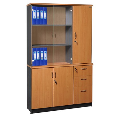 Kiểu dáng: Tủ có thiết kế gồm 2 buồng, phía trên có 2 khoang kính để tài liệu, phía dưới có 2 khoang cánh gỗ mở