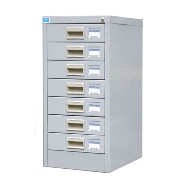 Tủ file tài liệu văn phòng 7 ngăn kéo lớn được thiết kế dạng hình hộp chữ nhật đứng, với 7 ngăn kéo lớn chuyển động trơn tru nhờ hệ thống ray trượt thép uốn chắc chắn. Mỗi ngăn đều trang bị tay nắm âm nhựa đen, dễ cầm nắm, giúp người dùng dễ dàng mở ra – đóng vào mà không gây tiếng ồn.